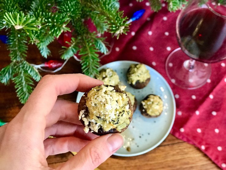 I could not be more excited for holiday parties this year! We’ve had snow on and off in Montreal, and this is the first year in many years after living in sunny, warm, places that it actually feels like Christmas. This weekend I’m celebrating with a holiday murder mystery dinner with my true crime book club. Shout out to the Montreal Murderinos! I love keeping Christmas food simple so everyone can walk around and snack, and I my favorite finger food is stuffed mushrooms! These are inspired by my chickpea crabcakes, and are so fast and easy to make! This is how we made it: