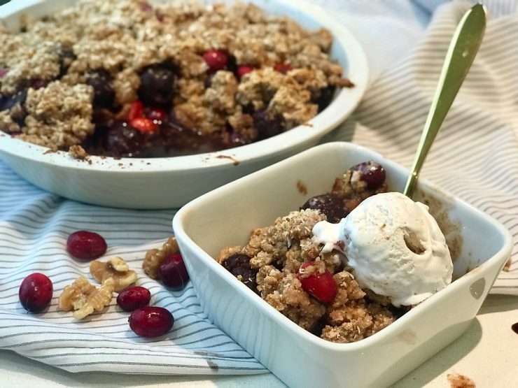 I’m kind of obsessed with cranberries. I rarely see them fresh at the grocery store outside of the holidays, and I love a good, tart fruit! I love a good cranberry jelly, chutney, muffins, and sauce. This holiday take on a traditional crisp is gluten free, oil free, refined sugar free, and delicious AF! This is how we made it: