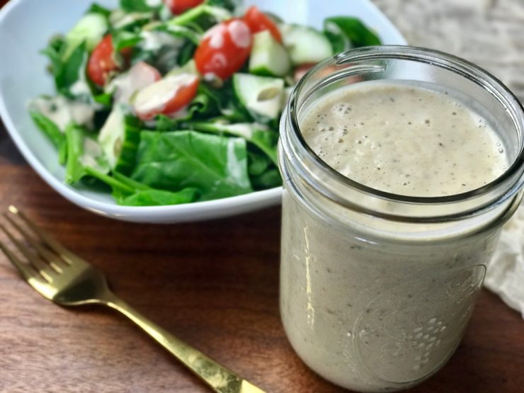 I’m not a big fan of salads because I’m a vata (shoutout to Ayurvedic medicine!), and cold foods are bad for my digestion, but I love pasta salad, and when I eat a salad, I like a nice, creamy Italian dressing! What if I told you this dressing is oil free? What if I also told you it’s a good source of protein and fiber? And it’s delicious! This is how we made it: