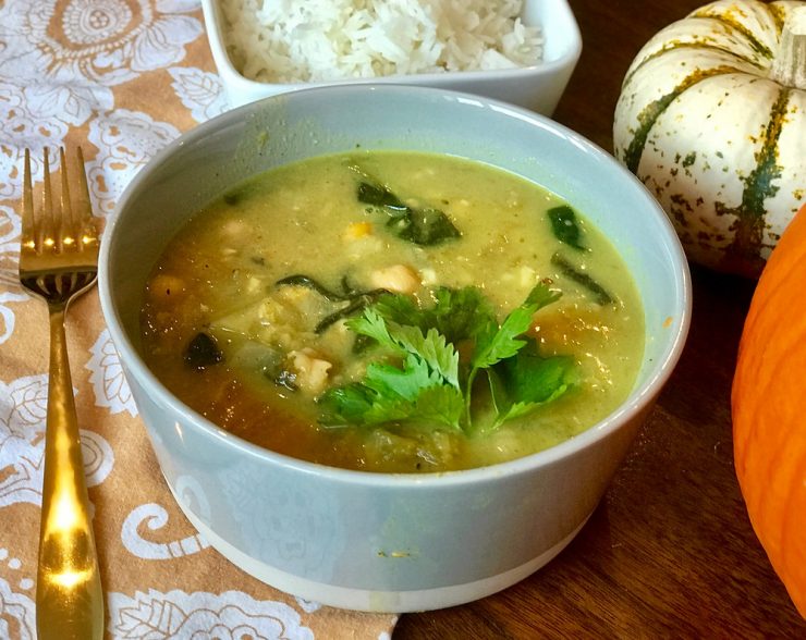 Cook for 20 minutes and then add the spinach and cilantro. Cook for an additional 10 minutes or until the pumpkin is soft. Adjust the seasoning and serve over rice.