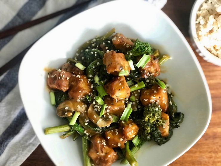 Coat the basket of the air fryer in a little oil. Toss each piece of marinated tofu in the cornstarch mixture to coat, and place it in the basket of the air fryer. You will likely have to work in two batches. Cook the tofu for 12 minutes at 370 F, flipping over halfway through. If you don’t have an air fryer, you can also bake the tofu. Baking the tofu at 350 F will take closer to 20 minutes flipping halfway through.