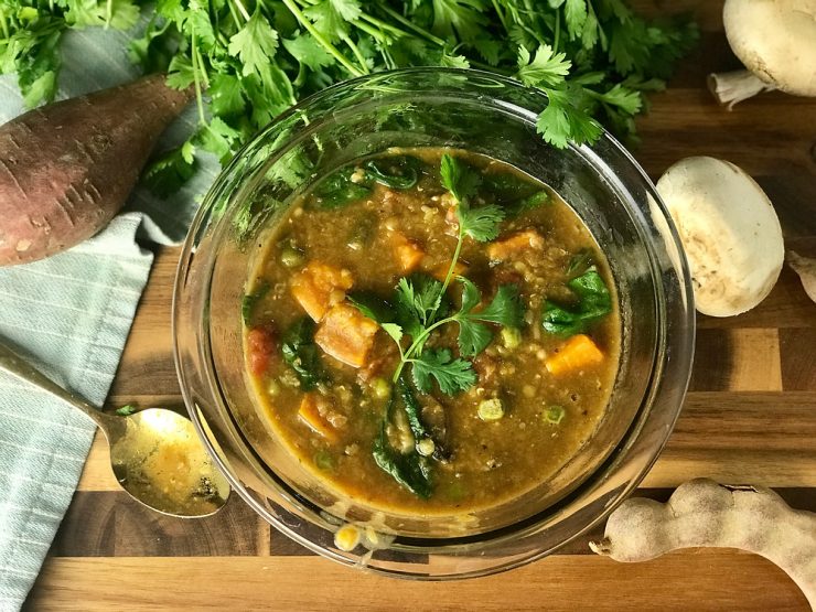 Rick has been sick for the last two days which means I get to have soup even though it’s a million degrees outside! This south Indian staple is the height of nutrition with lots of protein from lentils and peas, tons of vitamin C from greens and sweet potatoes. Plus, it’s delicious af. This is how we made it: