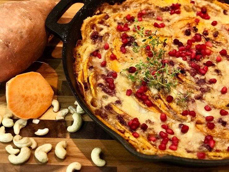 The holidays are upon us, and whenever I think about traditional sweet potatoes with marshmallows, I get a little sad. No shade to mini marshmallows, but does anyone really feel like they are adulting bringing sweet potatoes with marshmallows to a fancy table? This dish is so pretty and delicious that your mom will be blown away by your own personal growth over the last year, plus no one will even notice it’s vegan, gluten free, sugar free, and oil free. They will only notice that you should have made a bigger dish. This is how we made it: