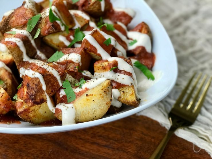 There’s no place I love more in the world than Barcelona, and my favorite thing to eat in Barcelona before I was vegan was patatas bravas! Fortunately, these spicy delicious potatoes are super easy to make healthier with homemade sauce and mayo. These are also gluten free, refined sugar free, and oil free. This is how we made them: