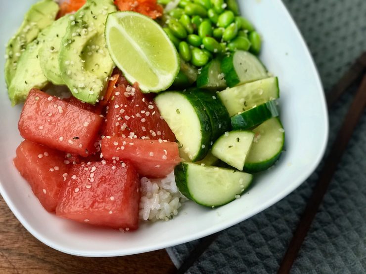 Poke bowls are the perfect, quick warm weather meal, and watermelon makes the best plant based replacement for ahi tuna. I’m embarrassed to say, that the first time I had a poke bowl was at a crummy quick service place in the Montreal airport, but it was such an awesome, healthy lunch that I decided to recreate it. Best of all, it’s vegan, gluten free, oil free, and refined sugar free! This is how we made it: